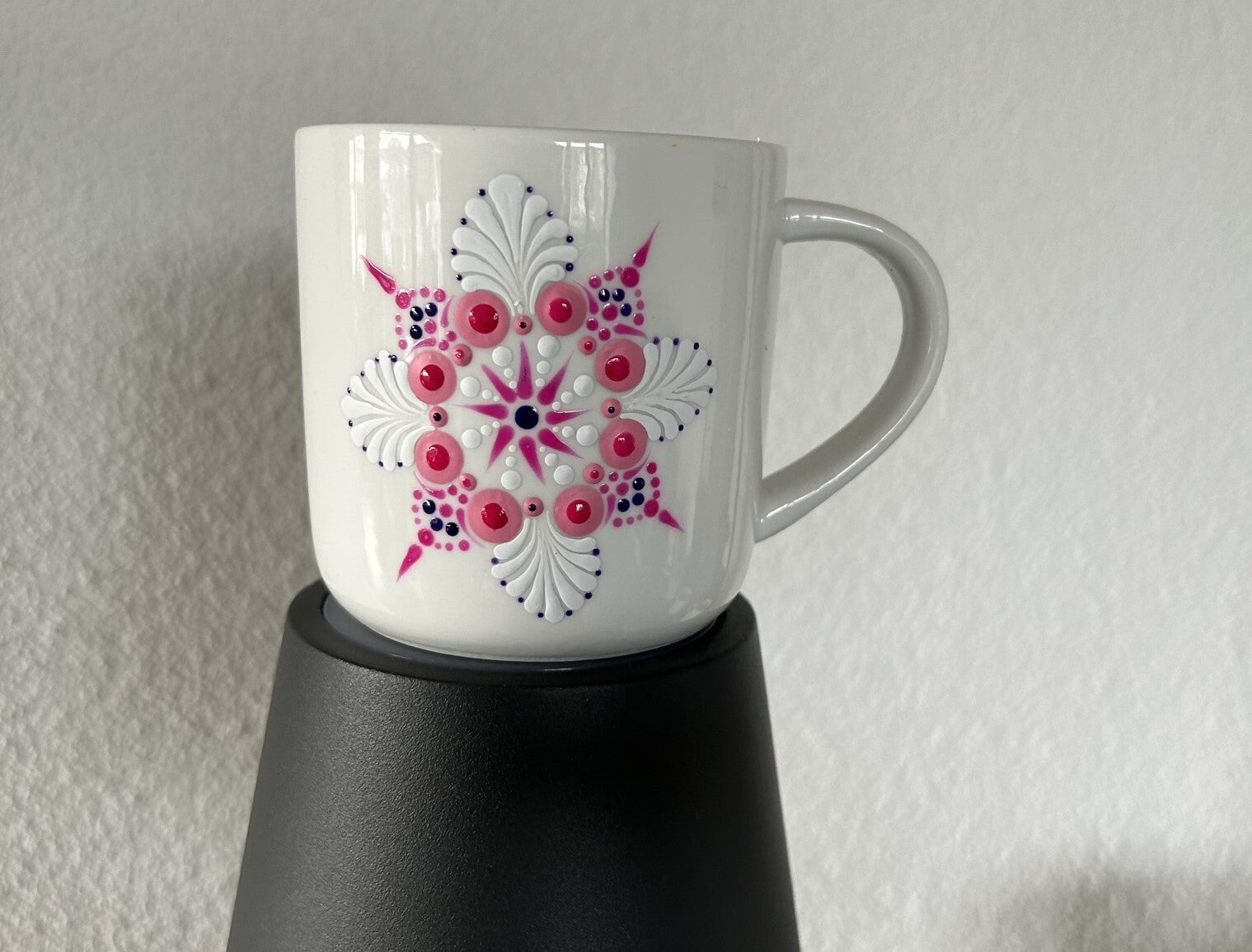 - Punkt für Punkt im Mandala-Stil wurde diese Tasse von Hand sorgfältig bedöttelt nach Dotting-Art.