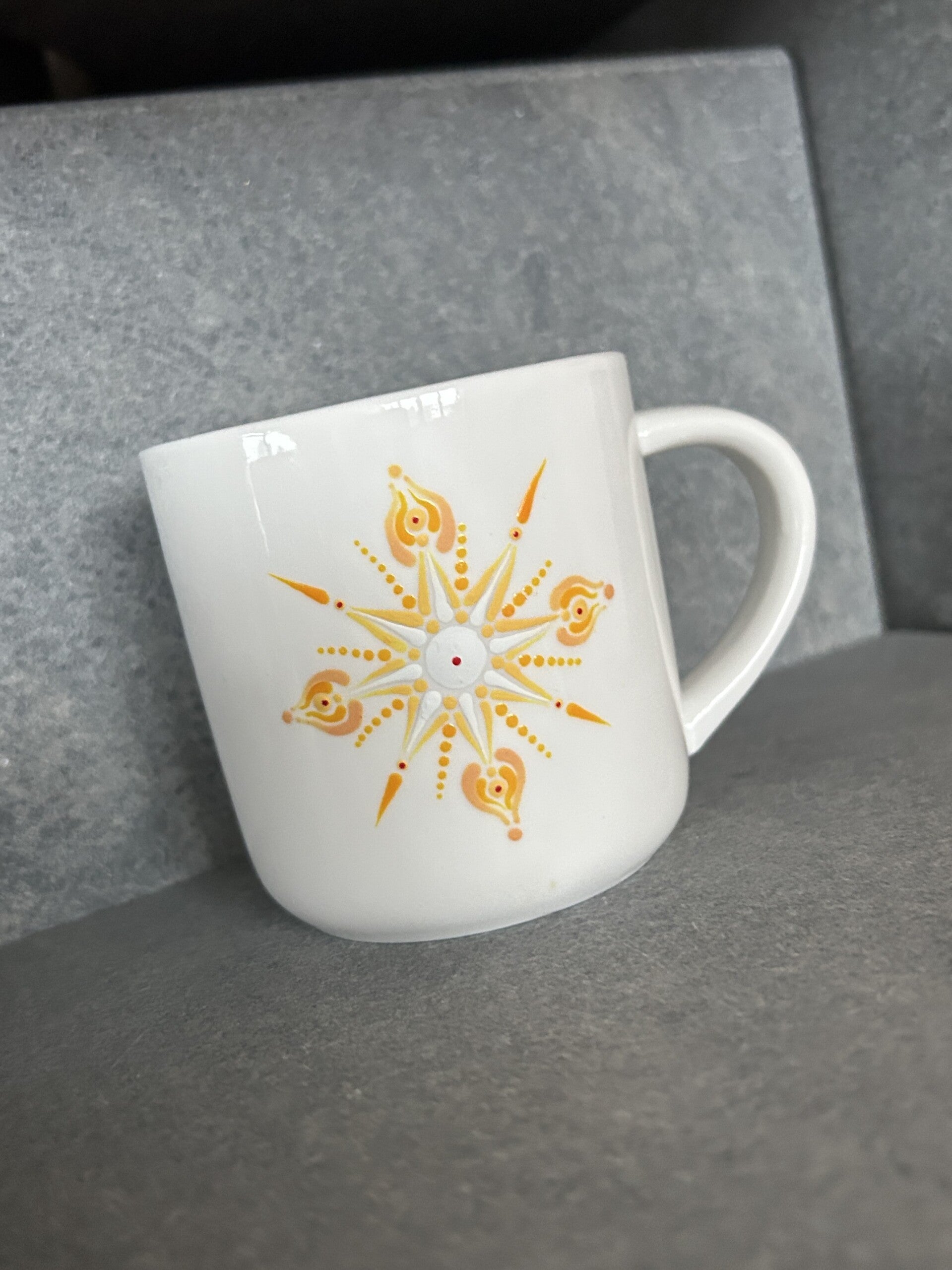 - So wie die Sonne - kräftig aber doch sanft - gelblich und warm - weiss und rein - anmutig und sanftmutig - fröhlich und besonnen - diese Einflüsse liess ich mit einfliessen in und so entstand diese fröhliche Tasse.