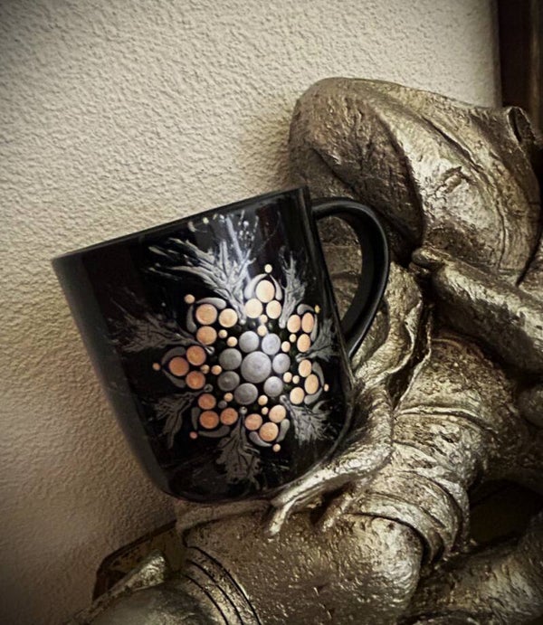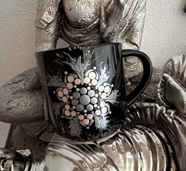 - Dieses Kaffeetassli ist in metalligfarbenen Nuancen bedöttelt.