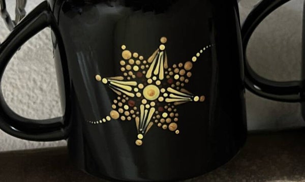 Punkt für Punkt wurde diese Tasse von Hand bedöttelt, danach eingebrannt damit es Geschirrspülertauglich ist.