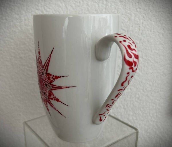 Diese Tasse ist mit kräftigen schönen Rot-Tönen erstellt worden - Energievoll - Kraftvoll - Passion pur - wild und ruhig - wie der Wind immer in Bewegung - mal kräftiger mal sanfter - genauso widerspiegelt sich diese Tasse und ist bei jedem Gemüt eine Bereicherung um zu pausieren und Energie zu tanken.