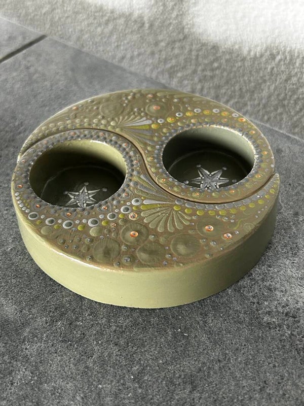 in den wundervollen erdigen sanften ruhigen Grün-Nuancen - sowie Tonerdengrün , olivengrün , erdiges graugrün und ein Hauch von Lindengrün - eigentlich erinnert dieser Candle-Light Balancer an die Kraft der Pflanzen - ob Kräuter oder schöne Bäume - ob die relaxten Stunden mit dem tiefen Durchatmen - er verschönert auf jeden Fall seine wohltuende energiespendene Stimmung.
