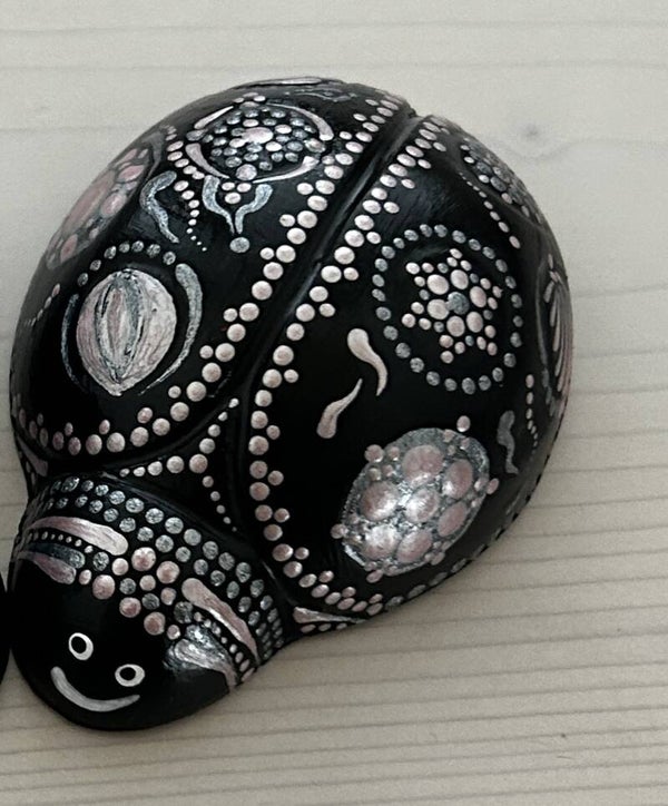 dieser besondere Happy Bug "Happyshiny" glänzt mit seinen rosa-metallic-perligen grau-silber-Nuancen. Alles in sanften metallicpearl-look - sehr sanftmütig, verspielt und zart - sowie sehr charmant.